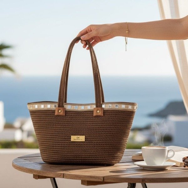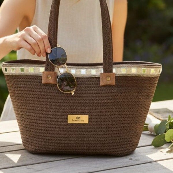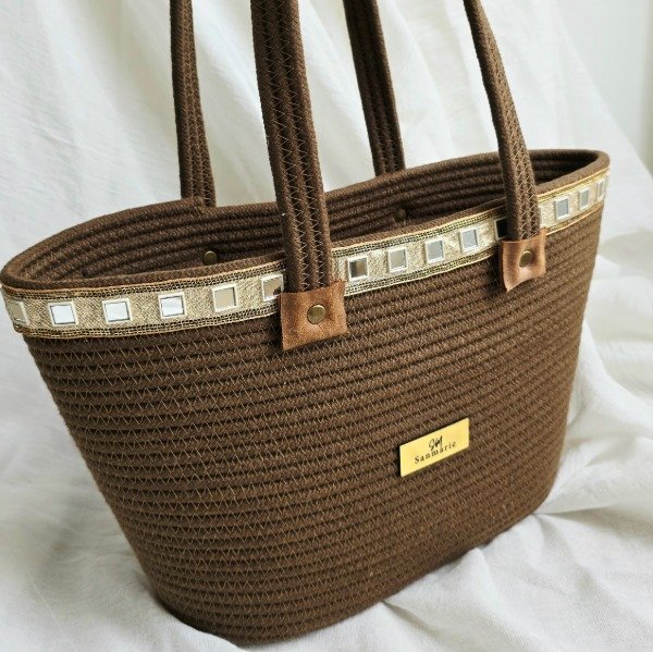 Bolso en cordón de algodón, con detalles en cuero y cordonería decorativa (24 cm de alto con una boca de 40 cm)