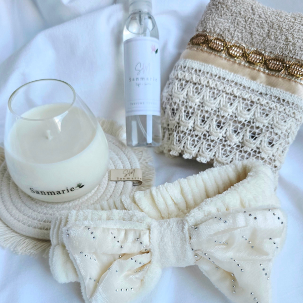 Vela aromática + Spray textil + Posa velas + Vincha "skin care" + Toalla "skin care"